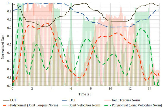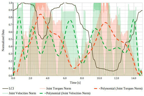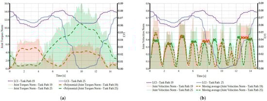 The initial segment of the performance analysis was focused on comprehending the overall dynamic performance and efficiency. This involved comparing the supplied joint torques with the resultant joint velocities. The norms of the joint torques and velocities were normalized given the maximum value achieved along the path waypoints and were plotted in the same chart for each of the executed tasks. Figure 11 presents the notable correlation between joint velocities and joint torques. It is observed that larger joint velocities were achieved with smaller joint torques in these optimal performance segments, where the LCI achieved its higher values. Larger values of the LCI reflect higher joint velocities with lower effort. Moreover, the variation in the LCI accurately tracked the changing relation, providing a valuable tool for the offline identification of efficient operating conditions.