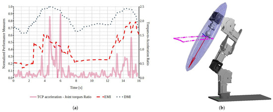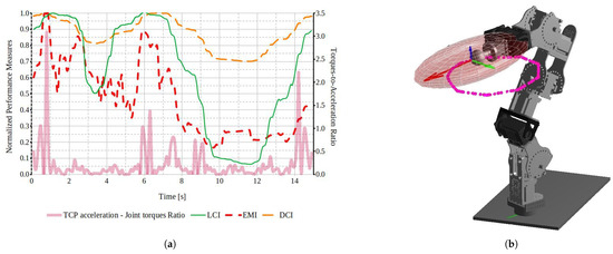 In Figure 14a and Figure 15a, the ratio extracted from robot data and the performance measures extracted from task simulation are plotted for a CP executed by the optimized EMI CP (ID: 1) and the optimized LCI RP (ID: 3) anatomies, respectively. The utilized performance measures are plotted in order to discuss the achieved accuracy in tracking the efficiency of producing TCP acceleration from the joints’ torques. As expected, the DCI did not provide adequate detail on the evolution of the ratio. Furthermore, the LCI presented the three main path segments where an optimal ratio could be found but adequate fidelity was still not achieved. The EMI demonstrated high sensitivity to dynamic changes, closely reflecting performance variations, thus providing detailed performance insights, but demanded a higher computational cost. In summary, the EMI presents a behavior that should become a useful tool for identifying maximum load scenarios during path execution, while metrics such as the DME and DCI can be useful for broader performance assessments where stability and less noise are advantageous. As previously discussed, the DCI should not be considered for a task-based dynamic performance analysis.