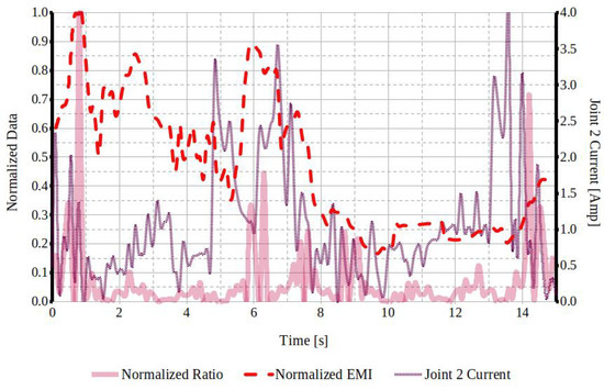 In Figure 16, data from the execution of a circular path are presented. The controller output was not smooth, exhibiting larger current spikes in segments where a higher torque-to-acceleration ratio was achieved. This indicated significant dynamic load changes. The EMI could track the current output behavior, but accuracy was reduced, reflecting the complexity of dynamic interactions during circular motion. In Figure 17, data from rectangular path execution are shown alongside the simulated DME. A similar non-smooth behavior was observed, with current spikes occurring during motion along the Y-axis. This movement was primarily facilitated by joints 2 and 3. The DME index, despite being less sensitive to rapid dynamic changes, could effectively capture the controller behavior with greater fidelity, pinpointing the possible high-stress segments more accurately. This suggests that DME should be a reliable indicator for predicting current spikes and dynamic stresses during linear motion.