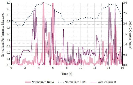 Building on previous findings, the performance measures identified task segments with higher torque-to-acceleration ratios, which exhibited larger TCP accelerations and increased joint currents. To examine these effects on joint controller efficiency, only current data from the second active joint were analyzed, as it bore the primary load for achieving the desired task path.