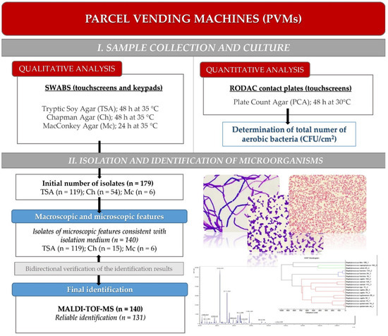 For the above reasons, this study undertook to assess the degree of microbial contamination of PVMs located in the city of Lublin, eastern Poland. The study aimed to determine the total number of microorganisms on the surface of the touchscreens of the machines and compare these numbers across the studied districts and courier companies. The next step was to identify the acquired microorganisms using traditional methods used in microbiological laboratories (including Gram staining, colony morphology, and biochemical characteristics) and modern methods (mass spectrometry). To the best of our knowledge, this study is the first microbiological analysis of PVMs.