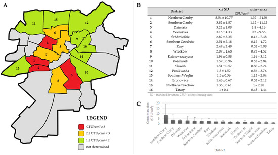 (A) The localization of analyzed districts in Lublin city along with their average level of microbiological contamination of parcel vending machines. (B) Results of qualitative microbiological analysis of parcel vending machines in 16 city districts. (C) Visualization of average means and standard deviation of bacterial counts on touchscreens of parcel vending machines in each district.