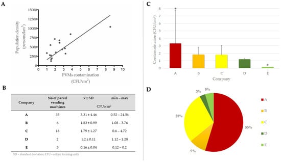 (A) The correlation between the population density in analyzed city districts and the microbial contamination of parcel machines. (B) Microbial contamination of parcel vending machines, according to the company. (C) Visualization of average means and standard deviation of bacterial counts on touchscreens of parcel vending machines, according to the company—an asterisk denotes a statistically significant in the average bacterial count on PVMs between districts. (D) Percentage of parcel vending machines belonging to different companies.