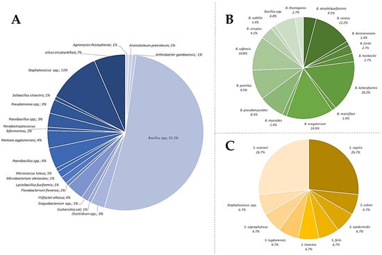 Distribution of all identified bacterial isolates (A) or bacilli (B) and staphylococci (C) species isolated from touchscreens of parcel vending machines located in Lublin, Poland. Percentages may not total 100 due to rounding.