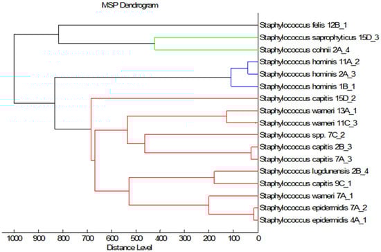 Next, dendrograms were created to illustrate the phylogenetic relationships between bacterial strains isolated from PVMs. The analysis demonstrated a high diversity of Staphylococcus species, with the most represented Staphylococcus epidermidis, S. capitis, S. warneri, and S. hominis (Figure 5). These strains differed in their degree of relatedness, as expressed by the distance levels on the dendrogram. Strains such as S. epidermidis 4A_1 and S. epidermidis 7A_2 showed minimal divergence, indicating that they are closely related and may originate from similar environmental conditions or exhibit similar adaptive characteristics. In contrast, strains like S. warneri and S. capitis exhibited greater proteomic distances, reflecting a higher level of diversity between these species. The dendrogram also highlights the presence of less common species, such as S. felis and S. saprophyticus, suggesting their infrequent occurrence in the PVM environment. However, their presence could be significant in the context of studies on the microbiome of public spaces.