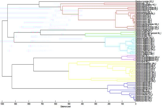Matrix-assisted laser desorption/ionization time-of-flight mass spectrometry on the UltrafleXtreme MALDI-TOF mass spectrometer (Bruker, Bremen, Germany) was used to identify bacterial isolates collected from the PVMs as previously described [15] at the Department of Epizootiology and Clinic of Infectious Diseases, University of Life Sciences in Lublin, Poland. Identification scores were interpreted according to the manufacturer’s guidelines: a score of ≥2.300 indicated reliable identification at the species level, 2.000–2.299 indicated probable identification at the species level, 1.700–1.999 implied identification at the genus level, and a score below 1.700 indicated unreliable identification. To investigate the relationships between particular Bacillus and Staphylococcus strains, we utilized the MALDI Biotyper 3.1 software, which applies the Unweighted Pair Group Method with Arithmetic mean (UPGMA) algorithm. The raw mass spectra were carefully processed through steps like smoothing and subtracting baseline to ensure uniform signal intensities. The MALDI Biotyper 3.1 software was further employed to generate main spectra profiles (MSPs) for each strain, using three replicates of the MALDI-TOF mass spectra for consistency and accuracy. These MSPs were then systematically compared, with the similarity between strains quantified through a score matrix. These MSPs were systematically compared, and the similarity between strains was quantified using a score matrix. This similarity matrix was used to construct a dendrogram, visually depicting the proteomic relationships and similarities between the analyzed strains.