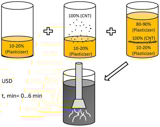 During sample preparation following these technological stages, certain drawbacks were immediately identified. In the first case, the primary carbon nanomaterial adhered to the surface of the glass measuring container when filled with the hydrocarbon plasticizer. In the second case, before ultrasonic dispersion, preliminary mixing of the MWCNTs was required due to their position on the surface of the hydrocarbon plasticizer caused by its high viscosity. This was completed using a glass rod, resulting in MWCNT losses due to particle adhesion to the rod’s surface.