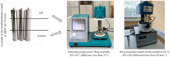 The homogeneity of the resulting binders was determined according to Russian State Standard GOST R 52056-2003 [52]. The essence of the method involves visually determining the binder’s homogeneity using a glass rod. Before the test, the binder sample should be heated to a temperature 10 °C higher than the preparation temperature of the modified binder and stirred for 5–6 min. The glass rod is dipped into the prepared sample for 3–4 s, then removed, and the binder’s flow off the rod and the condition of the binder film on its surface are visually evaluated. The modified binder should flow off the rod evenly, and there should be no clumps, lumps, or granules on its surface. The homogeneity of the binder is determined by comparing the results of three tests. If two out of three tests give a positive result, the modified binder is considered to have passed the homogeneity test.