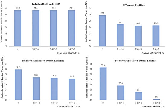 To calculate the enthalpy contribution (ΔH), which reflects the energy of interaction between carbon nanotubes and hydrocarbon plasticizer molecules, the surface tension in the “multi-walled carbon nanotubes-hydrocarbon plasticizer” dispersion system was determined. Optimal ultrasonic dispersion times were established beforehand, during which the minimum average diameters of multi-walled carbon nanotubes were observed in these dispersion systems, as shown in Table 3. The results of surface/interfacial tension measurements at a temperature of 25 °C are presented in Figure 3.