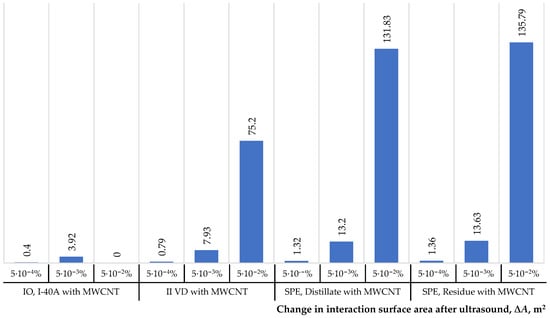 The change in the total surface area of MWCNT interaction in the system with a hydrocarbon plasticizer (ΔA) is calculated as the difference between the total surface area before (A1) and after ultrasonic dispersion (A2).
