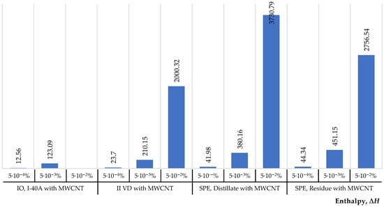 Enthalpic contribution and its impact on Gibbs free energy. As seen from the data (Figure 5), plasticizers such as selectively purified extracts demonstrate high enthalpy values (ΔH), indicating significant energy costs for dispersing MWCNTs in these systems. At high concentrations of MWCNTs (e.g., 5·10−3%), the enthalpic contribution may dominate the entropic one, leading to a deterioration in Gibbs free energy (ΔG) values. This explains why, with increasing concentrations of MWCNTs, the overall stability of PNB may decrease despite an increase in the number of microscopic states. High enthalpic costs complicate the dispersion process and lead to a less stable system.