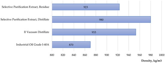 where —the relative density, defined as the ratio of the density of petroleum products at 20 °C to the density of water at 4 °C. Since the density of water at this temperature is 1 g/cm3, the numerical values of relative and absolute density coincide. The absolute density of hydrocarbon plasticizers was determined using hydrometers in accordance with the requirements of Russian State Standard GOST 3900-2022 [51].