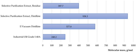 To calculate the molecular mass of hydrocarbon plasticizers, which are various petroleum fractions, Craig’s formula [50] is used. This formula shows the relationship between molecular mass and the relative density of petroleum fractions as follows: