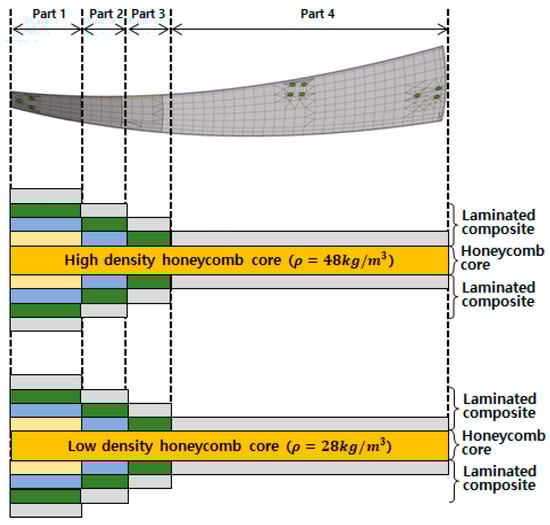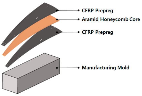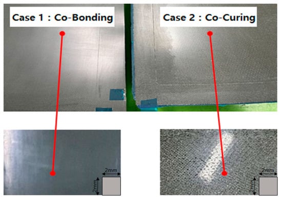 The second variable for the manufacturing process was considered to be the application of the adhesive film. Generally, when manufacturing a sandwich composite by applying an aluminium honeycomb core, an adhesive film should be applied to the contact surface for adhesion between the honeycomb core and the carbon fiber sheet. However, when applying an aramid core, the core and the sheet can be bonded through the resin impregnated in the prepreg, so, in Cases 3 and 4, the adhesive film was excluded, and the production was performed using the co-curing process [19].