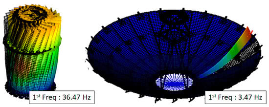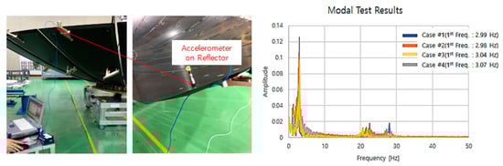 In order to verify the performance of the reflector based on the manufacturing process, a modal test of a single reflector was performed. The modal test was performed using accelerometer-type Dewetron equipment. After attaching an accelerometer to the end of the reflector, the reflector was excited using an impact hammer to measure the stiffness of each of the four types of reflectors when in deployed conditions. In order to simulate the deployment shape of the actual antenna during the test, a deployment structure was attached to the top, middle, and bottom of the antenna, as shown on the left side of Figure 13, and the test was performed at the same deployment angle as the actual operating conditions.