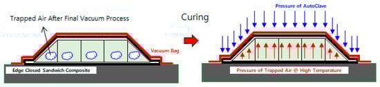 If the sandwich composite is manufactured without the adhesive film using un-perforated honeycomb core, gas may remain inside of the core cell, as shown in Figure 4, and some of the gas inside of the cell may not be removed during the vacuum bagging process. The composite reflector is formed at a low curing pressure (0~10 psi) due to the strength characteristics of the aramid core. In this case, the pressure of the gas inside of the core cell increases under high-temperature curing conditions (170~180 °C), and if the internal pressure is higher than the curing pressure applied from outside of the structure, the bonding between the core and the sheet may not proceed smoothly (Figure 5).