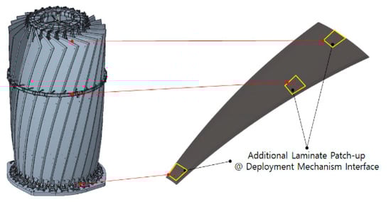 The final variable for the manufacturing process was considered to be the additional layup process to laminate additional reinforcement to the fastening portion of the composite main reflector. As shown in Figure 8, the deployable reflector antenna includes deployable structures at the top, middle, and bottom of the antenna, and the deployable structures are fastened through the fastening interface of the main reflector. Accordingly, when a load, such as a launch load, is applied to the antenna structure in the stowed state, stress concentration may occur at the interface, and the interface stiffness with the lower deployable structure may also affect the stiffness of the antenna when deployed. Therefore, Case 4 was manufactured by locally performing an additional 2-ply lamination.