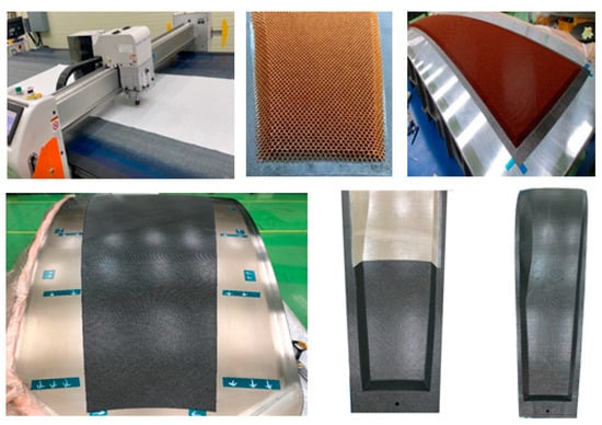 (4) A co-curing process involving the reflective surface–honeycomb core (with perforated holes)–outer surface, excluding the adhesive film. Then, the fastening interface part is additionally reinforced and laminated, the venting path is secured, and curing is performed at once at low pressure (10 psi)