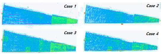 The results of the non-destructive test are shown in Figure 11. In the case of the main reflectors in Cases 1 and 2 that applied the adhesive film, only a difference in the measurement signal (blue, green zone) according to the lamination pattern was observed, and no separate defects were detected. In the case of the main reflectors in Cases 3 and 4 that did not use the adhesive film, a defect signal (red zone) was detected in some edge areas, but the defect size was very small (less than 1 inch), so it was determined that there was no structural abnormality.