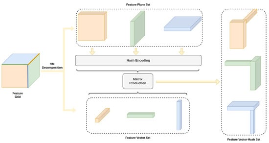 We proposed a novel VM decomposition-based matrix factorization method specifically designed for the field of 3D reconstruction. In our approach, the feature planes derived from VM decomposition are encoded using multi-hash techniques. These encoded planes are then combined with the feature vectors obtained from VM decomposition via matrix multiplication, ultimately forming a set of hash tables and vectors. Through this decomposition method, redundant parts in the original feature planes can be effectively filtered out by the hash algorithm.