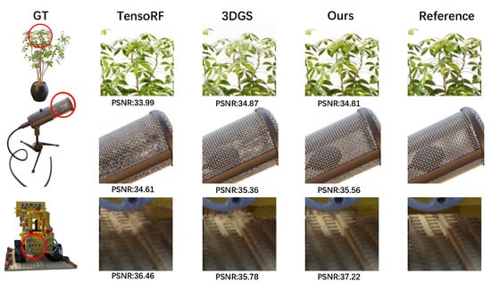 In this section, we discuss our implementation details. We implement a Hash-Low-Rank Decomposition-Based Neural Radiance Fields method based on TensoRF [13], which produces the baseline. A small MLP with two FC (fully connected) layers (with 256-channel hidden layers) and Softplus activation to implement the color decoder to decode the hybrid neural features (two kinds of implicit encoding features) and handle the collision in the hash table as D is represented in Equation (7). We use Adam [20] optimizer with an initial learning rate of 0.02 for the neural features in the tensor grid and 0.001 for the feature grid and appearance MLP decoder. We optimized the proposed method for 30,000 steps with a batch size of 4096-pixel rays on a single RTX 4090 GPU (24 GB). We applied a feature grid with a total number of voxels. For the methods we selected, we re-ran the experiments for TensoRF [13], I-NGP [14], and 3DGS [12] on our own hardware to ensure a fair comparison. For earlier methods, however, we directly used the results reported in the TensoRF paper. This decision was made because these earlier methods lag significantly behind recent SOTA methods and changing the hardware would not result in substantial improvements.