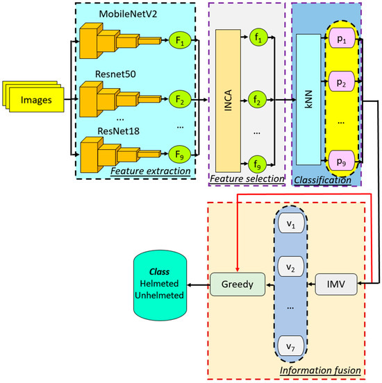 Block diagram of the proposed helmet recognition model. The abbreviations in this figure are as follows: F: feature vectors obtained from pre-trained CNNs, INCA: iterative neighborhood component analysis, f: selected feature vectors, kNN: k-nearest neighbor, p: outputs obtained from classifiers, IMV: iterative majority voting, v: weighted voting outputs. In this model, nine feature vectors were extracted from pre-trained CNNs, and these pre-trained CNNs were trained on ImageNet1k, and the most informative features of these features have been extracted by deploying the INCA feature selector; this feature selector is a self-organized feature selector. In the classification phase, by deploying the kNN classifier, nine classification outcomes were generated, and the generated nine kNN-based classification outcomes were utilized as input for the IMV. IMV created more than seven classification outputs. In the last phase, the best out of the 16 created (=9 kNN-based + 7 voted) outcomes were selected by deploying a greedy algorithm. The greedy algorithm selects the outcome with the maximum classification accuracy.