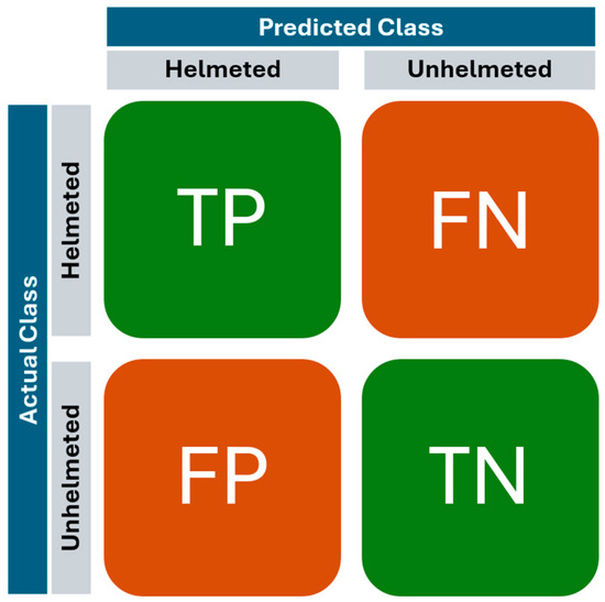 The confusion matrix used to compute the classification performances. Herein, we have used the helmeted class as a positive class and the unhelmeted class as a negative class. By using the depicted parameters, the classification performances have been computed. Green for true and orange for false classifications.