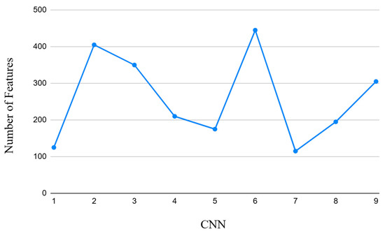 The proposed model initially extracted nine feature vectors, each comprising 1000 features. Subsequently, INCA was employed to identify the most efficacious features for addressing the issue. The number of selected features in accordance with the CNNs utilized is illustrated in Figure 4.