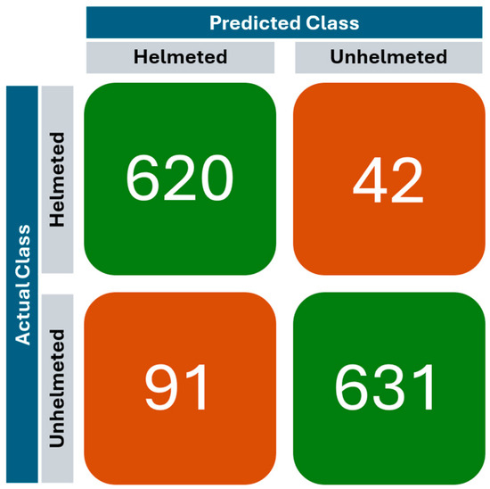 Confusion matrix of the proposed model. Herein, there are 620 true helmeted, 42 false unhelmeted, 91 false helmeted, and 631 true unhelmeted predictions where helmeted positive and unhelmeted define negative classes. Green for true and orange for false classifications.
