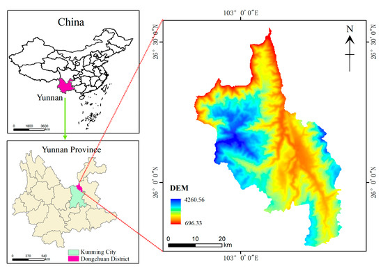 Dongchuan District, under the jurisdiction of Kunming city, Yunnan Province, is located on the northern edge of the Yunnan–Guizhou Plateau (China). Its longitude ranges from 102°47′ E to 103°18′ E, and its latitude ranges from 25°57′ N to 26°32′ N, covering a total area of approximately 1858.79 km2. Its specific location is shown in Figure 1. The region features high mountains and deep valleys, with dramatic differences in elevation. Influenced by the Xiaojiang fault zone, it is a seismic zone with fractured surface rocks and poor stability. Climatically, this area has a subtropical monsoon climate, contributing to a fragile geological environment. The area is rich in mineral resources, but excessive mining and cultivation have severely depleted forest resources. Owing to its unique geological and topographical features, coupled with long-term human activities, Dongchuan District frequently experiences natural disasters such as landslides, mudslides, and mountain collapses, which pose significant threats to ecological security and socioeconomic development.