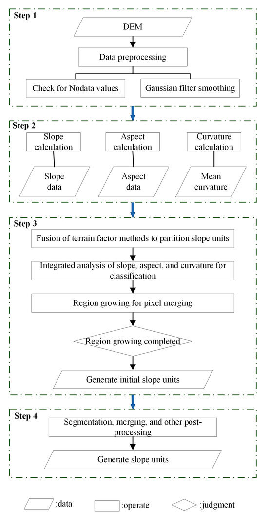 In this paper, a DEM-based slope unit division scheme aimed at accurately dividing the surface into contiguous areas with similar slope, aspect, and curvature characteristics is proposed. This method achieves slope unit division on the basis of the principle of minimum regional heterogeneity. Unlike traditional hydrology-based subdivision methods, this approach relies more on terrain geometry to reflect natural slope variations more accurately. By combining a region-growing algorithm, starting from DEM grid pixels, it recursively expanded the neighborhood through region growing. This process assigned adjacent pixels with the same slope, aspect, and curvature categories into the same slope unit. Thus, it divided the entire study area into continuous, uniform, enclosed regions.