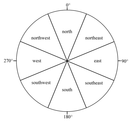 The aspect significantly impacts the subdivision of slope units, primarily because it is related to variations in environmental factors such as solar radiation, the rainfall distribution, and temperature conditions. These differences directly affect the physical properties, hydrological processes, vegetation cover, and the geological stability of slopes, thereby influencing the risk level of landslides. Therefore, when subdividing slope units, we applied the eight-direction aspect classification [35], dividing the slopes into subunits oriented towards different directions. The aspect division diagram is shown in Figure 3.