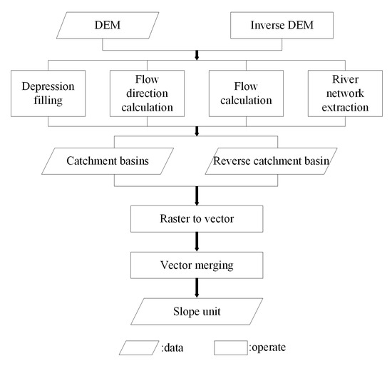 - Yan, G.; Liang, S.; Zhao, H. Improvement and implementation of slope unit division method based on GIS. Sci. Geogr. Sin. 2017, 37, 1764–1770. [Google Scholar] [CrossRef]