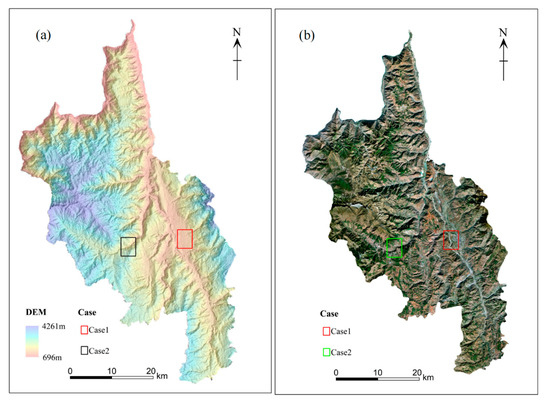 Shaded relief (a) and remote sensing imagery (b): flat zone (case 1) and mountainous zone (case 2).