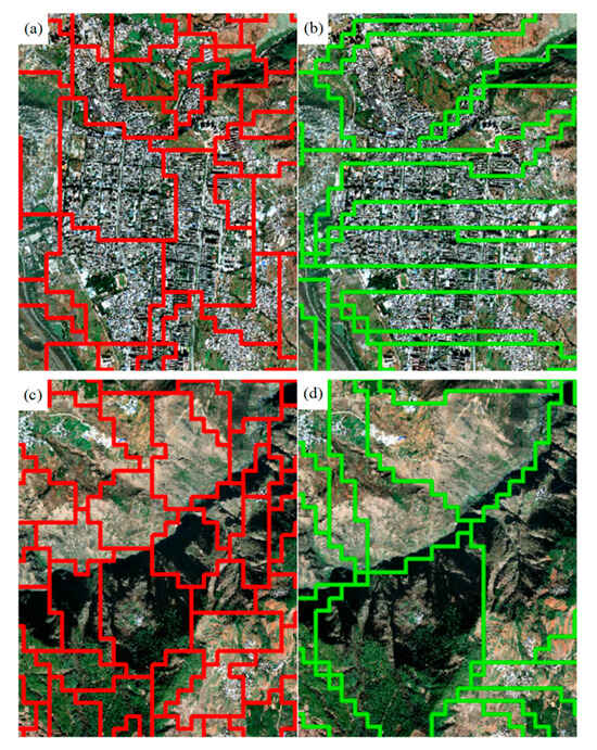Slope units extracted via the TFPF-SU and hydrological methods: (a) Case 1—the TFPF-SU method is used to divide the slope units; (b) Case 1—the hydrological method is used to divide the slope units; (c) Case 2—the TFPF-SU method is used to divide the slope units; and (d) Case 2—the hydrological method is used to divide the slope units.