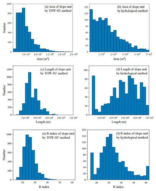 The unit size is crucial for mapping landslide susceptibility, as various indicators describing geological and environmental factors are extracted on the basis of slope units. To make the environmental factors of each unit comparable, the area covered by each unit should be similar. In this study, size uniformity can be reflected by the distribution of the unit area. Figure 7a,b shows the area distributions of the slope units extracted via the two methods. The TFPF-SU method divides the region into slope units with areas generally between 100,000 and 500,000 m2, with 69.93% of the units falling within this range. The hydrological method divides the region into slope units with areas generally between 20,000 and 1,000,000 m2, with 38.78% of the units falling within this range. In addition, the average, standard deviation, minimum, and maximum values of the slope unit area obtained with the TFPF-SU method are 422,774, 286,190, 1819, and 4,802,357, respectively, and those for the hydrological method are 1,600,211, 1,381,013, 21,829, and 13,206,480, respectively. Overall, the TFPF-SU method more uniformly extracts slope elements.
