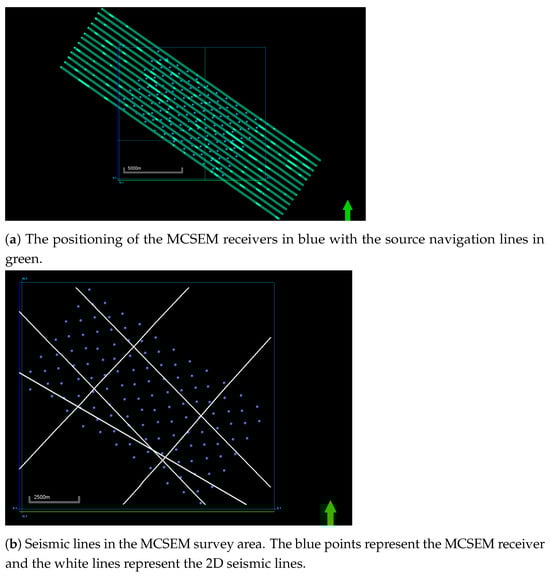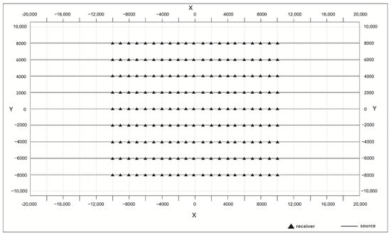 The model covers a total area of 320 km2. The survey configuration (Figure 4) has nine receiver lines, and seven source lines running at 50 m above the flat sea bed. The receiver lines are equally spaced, with a separation of 2000 m. Each line has 21 receivers spaced by 1 km. The source lines extend from 10 km to the left of the first receiver to 10 km to the right of the last receiver, between y coordinates −8000 m and 8000 m. The transmitter positions are at 100 m intervals.