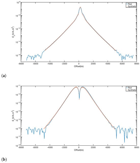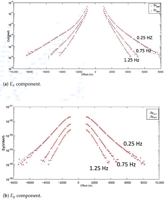 A data sample illustrating the small noise level in this dataset and the fit obtained by the generated synthetic data is shown in Figure 21, which shows curves for the and components in one receiver for one transmitter pass. Observe that the signal to noise ratio is large for many of the curves, but that the noise overwhelms the signal in the longest offsets. The synthetic data closely matches the field data in areas where the earth is layered, but less so in areas strongly influenced by 3D structures.