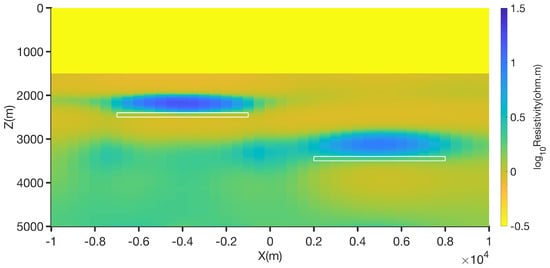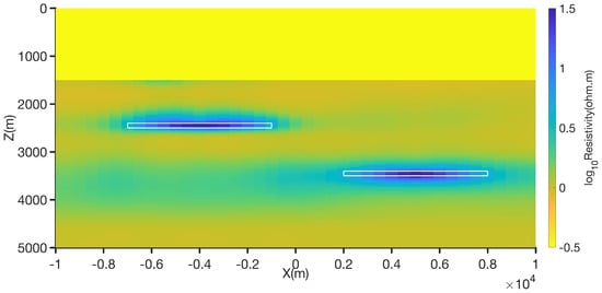 In the exploration work, it is sometimes possible to use well logging information to drive the inversion process. In this example, this kind of information is input, in addition to the smoothing constraints, as the resistivity of a single cell at the true positions at the centers of both targets. The input resistivity is 100 ohm-m, and the weighing parameter
