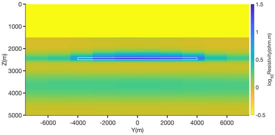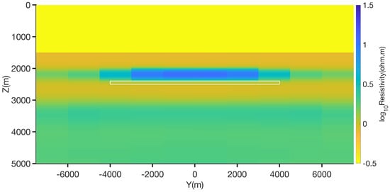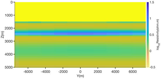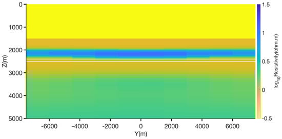 The same inversion grid of the first example was used, but cropped in the y direction between −4500 m to 4500 m. Again, the resistivity start model was a homogenous layer of 1 ohm-m from the sea bed to 4500 m and the last layer with 250 ohm-m.