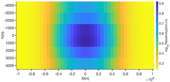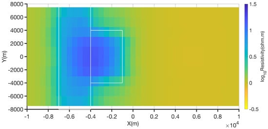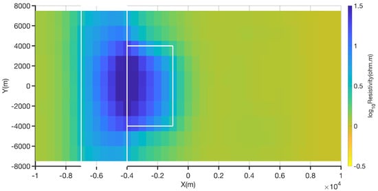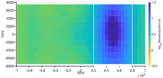 Figure 17 shows a vertical section on the plane at , and Figure 18 shows a vertical slice in the plane on m, with the resistivity values recovered by the inversion process. The body appears in the final section well positioned in depth. The presence of the resistive basement is apparent, with its top interface located close to the true depth by the sharp vertical variation in the resistivity. The region below the body is detected with less sensitivity by the data and appears in the final model with lower resistivities than the true values.