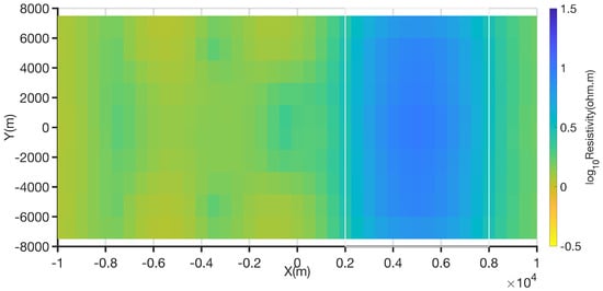 Due to the sparsity of data points in the area, the columns corresponding to the CMPs have 300 m sides. This implies low spatial resolution and limits the capacity of the inversion to detect sub-vertical bodies, such as resistivity variations associated with fractures. However, it allows for the identification of regional tendencies in the resistivity structures. The mesh in depth has increasing thickness to account for variations in sensitivity, and the bathymetry is addressed through regularization that connects the lateral cells.