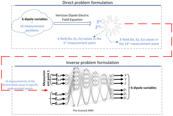 Neural networks can learn to approximate functions of arbitrary complexity based on training data, i.e., the inputs and outputs of the function. The neural network training was performed by analyzing artificially generated datasets from the electric field equation in vector form at various positions, as discussed in the next section. The inputs of the proposed were the electric field vector values, for the specific measurement setup, and the outputs were the parameters of the dipole sources (electric dipole position, and electric moment vectors). During training, the weights of the network are evaluated iteratively in order to minimize a predefined loss function that compares the target (artificial dipole) and predicted output values, i.e., predicted dipole parameters. In contrast to heuristic approaches, in which the exploration of a solution space is time-consuming as the algorithm attempts iteratively to identify the set of dipole parameters that best fit the measurement dataset, a pre-trained neural network offers a direct, instant, real-time evaluation of the solution (straightforward calculation of the dipole parameters) during the measurement campaign, enabling system level predictions regardless of the system architecture complexity. The core idea of this work is that for a custom measurement setup, such as the one presented herein and studied in the authors’ previous work [2], an ANN (i.e., the inverse dipole field equation for the specific measurement setup) pre-trained with simulated data, can instantly and accurately predict the radiating source based on field measurements. Moreover, in a continuous measurement data stream the ANN architecture is capable of providing a direct stream of results. It should be noted that for different measurement setups and boundary conditions (i.e., measurement points and variables domain) other ANNs should be re-trained entirely, starting with the generation of new simulated data, since those would be totally different problems. In the following sections, the measurement methodology is briefly presented along with the ANN architecture and results comparison.