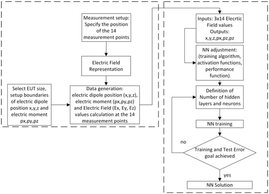 A brief description of the methodology followed in this work is presented through the flow chart in Figure 4. In the left block, enclosed in the dashed lines, the steps followed from the measurement setup to the training data creation are depicted. Thus, initially, the 14 measurement points were defined and the equations of the electric field were formulated. Then, the size of the EUT (equipment under test) was determined, and based on this, the limits of the position of the electric dipole. At the same time, the appropriate boundaries of the electric moments px, py, and pz were selected. Hence, through the aforementioned steps, the artificial data were generated in a MATLAB R2022b environment. These data, as shown in the right block of the flow chart, were fed into neural networks, where the electric field values were the inputs and the six dipole parameters (x, y, z, px, py, pz) were the target outputs. Afterward, the necessary adjustments to the neural network were carried out, such as the selection of the appropriate training algorithm, the activation function, and the performance function. The next step was the definition of the number of hidden layers as well as the number of neurons. Then the trainings were performed. It should be mentioned that for each specific number of hidden layers, several neuron number tests were performed in order to find the optimal number of neurons in each hidden layer. When the training and test error goal was achieved, the training was stopped and the neural network solution and results were stored; otherwise, a different number of hidden layers and neurons were tested.