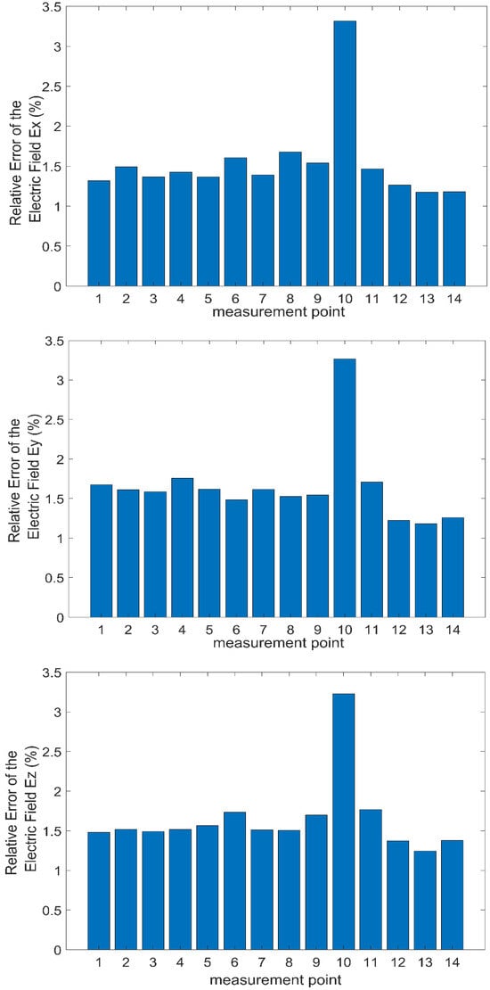 The test relative error of the electric field vector at the 14 measurement points and for the case of 40,000 data (4000 test data) and learning rate is depicted in Figure 5. From this Figure, it is readily apparent that the electric field vector can be accurately reproduced from the EDMnet’s predicted values (, as the relative error between the generated and predicted values at the 13 from the 14 measurement points is less than 2%.