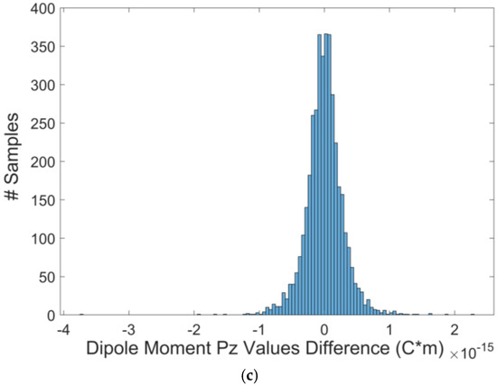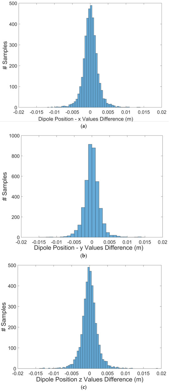 Difference between generated and calculated values of (a) x dipole position, (b) y dipole position, and (c) z dipole position.