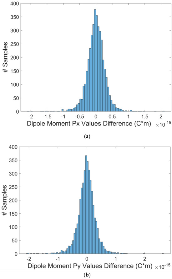 Figure 6 illustrates the deviation between the test generated and calculated (output of the neural network) values of the position and electric moment, of the test samples (10%) for the case of 40,000 data samples and the learning rate . Figure 7 presents the corresponding differences in the electric moment values. It should be noted that in the majority of the test samples, the difference between the predicted and the initially generated samples’ position is smaller than 5 mm, while more than 40% of the test samples had a maximum difference in position of 2 mm per axis. Moreover, the difference in the electric moments of the generated dipoles and the predicted ones was also smaller than , while 40% of the test sample had a difference of less than , rendering a notable accuracy.