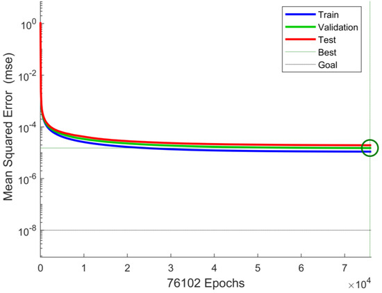 Next, Figure 8 depicts the neural network performance (Mean Square Error) for the training, test, and validation data during the training. As can be observed, training was completed in 76,102 epochs and the three curves (training, validation, and test) converge almost in the same value of the Mean Square Error.