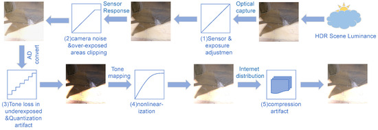 - The sensor outputs a voltage corresponding to the amount of light, and camera noise is introduced during the process of converting the optical signal into the electrical signal, as shown in the following formula: , where denotes the converted electrical signal, represents the optical signal, G represents the sensor gain, and N represents noise. Additionally, excessive electrical signals in the conversion process are cropped due to saturation, leading to the loss of information in the overexposed area, which can be expressed as: , where represents the sensor’s electrical signal output and represents the maximum threshold for electrical signals.