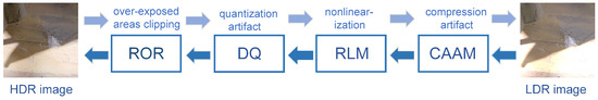 By analyzing the principles of the LDR imaging pipeline, the operations that lead to loss of image quality are classified into six steps: sensor and exposure adjustments, camera noise, overexposed areas clipping, tone loss in underexposed areas and visual artifacts introduced during the quantization process, nonlinearization, and compression of artifacts. The effect of the loss of quality of the pictures is also shown in Figure 2. It outlines the principles of the imaging pipeline, from HDR Scene Luminance to LDR image formation, as well as the image quality loss operations introduced throughout the process. Based on reversing these operations, which cause a loss of image quality, an LDR–HDR framework is proposed to delineate the imaging process of generating an HDR image from an LDR image into several stages: exposure adjustment, denoising, recovery of overexposed regions, dequantization, reconstruction of linearized mappings, and suppression of compression artifacts.